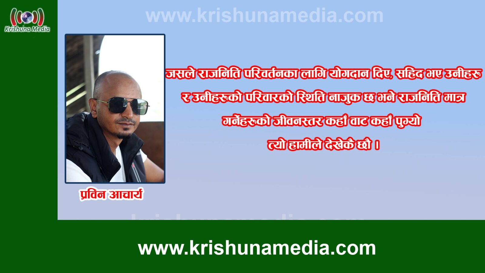 जनताहरु सधै पिडित नै छन्, त्रसित छन्, देशमा लामो समयसम्म विविध राजनैतिक,सामाजिक र आर्थिक द्वन्द क्रान्ति भए तर जसले राजनिति परिवर्तनका लागि योगदान दिए, सहिद भए उनीहरु र उनीहरुको परिवारको स्थिति नाजुक छ भने राजनिति मात्र गर्नेहरुको जीवनस्तर कहाँवाट कहाँ पुग्यो त्यो हामीले देखेकै छौ । जसको ढाँडमा टेकेर राजशैलिमा जीवन जिउनेहरु आज ति पिडा र दयनीय अवस्थामा जीउनेहरुलाई देख्दैनन् ।