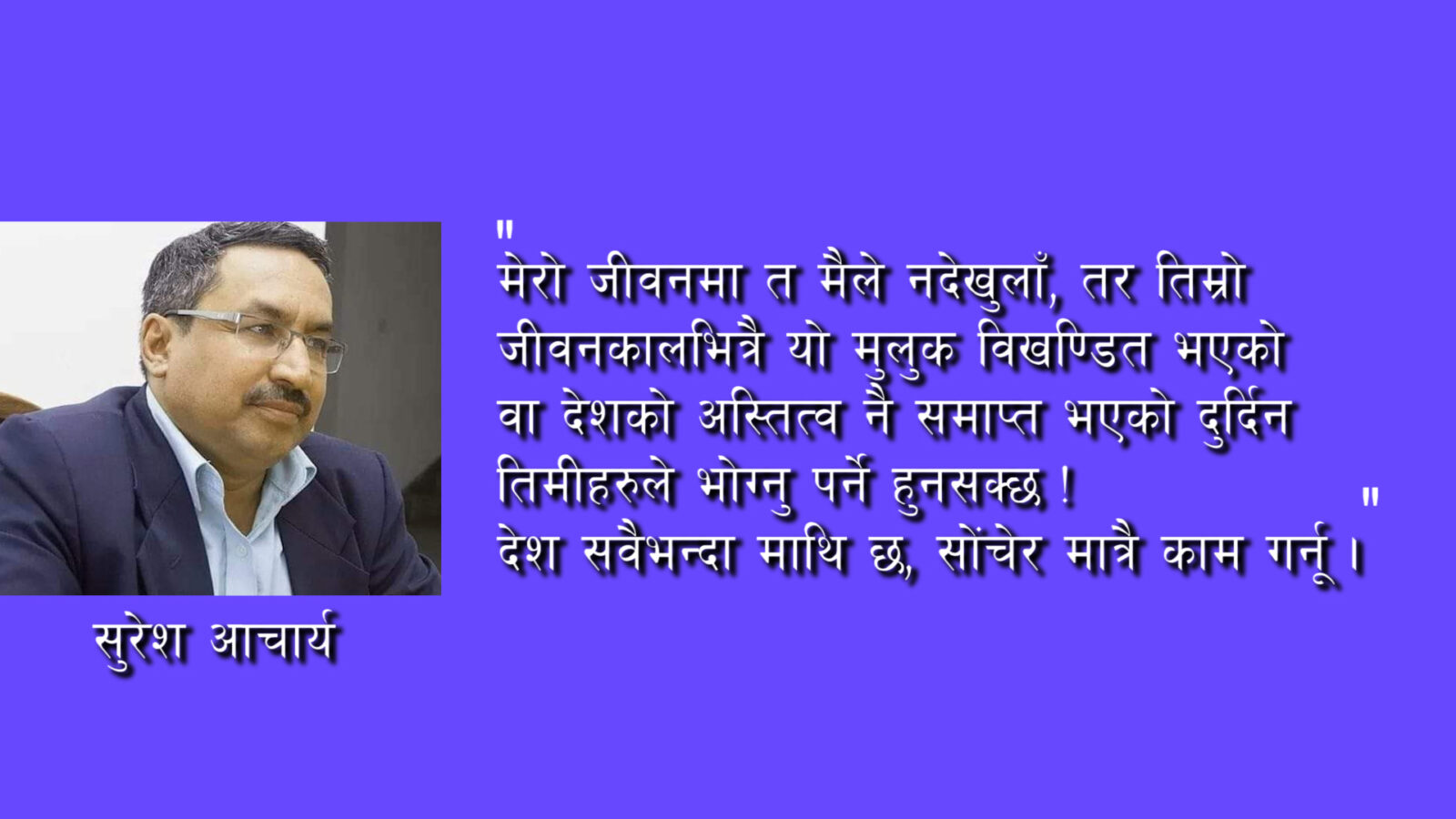 एक महिनाअघि स्वर्गे हुनुभएका मेरा पिताजीले अस्पतालको मृत्युशैय्यामा मलाई भन्नुभएको कुरा म झलझली सम्झिरहेछु, मेरो जीवनमा त मैले नदेखुलाँ, तर तिम्रो जीवनकालभित्रै यो मुलुक विखण्डित भएको वा देशको अस्तित्व नै समाप्त भएको दुर्दिन तिमीहरुले भोग्नु पर्ने हुनसक्छ !