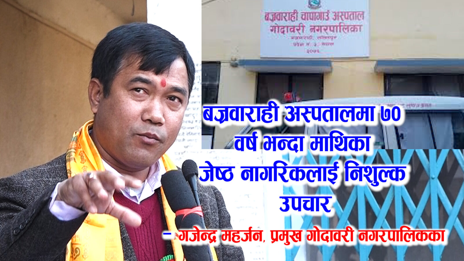 ललितपुर । गोददावरी नगरपालिकाको बज्रवाराही अस्पतालमा ७० वर्ष भन्दा माथिका जेष्ठ नागरिकलाई निशुल्क उपचार हुने भएको छ । केहि दिन अघि ठेचोको जेष्ठ नागरिक चौतारीले आयोजना गरेको कार्यक्रममा बोल्दै नगर प्रमुख गजेन्द्र महर्जनले उक्त जानकारी दिएका हुन् । जेष्ठ नागरिकहरु बज्रवाराही अस्पतालमा भर्ना भई उपचार गर्नु परेमा उपचार निशुल्क गरिपनि प्रचारको कमीले उक्त जानकारी धेरै नगरवासीमा नभएको गुनासो पोखे । भर्ना गरेको अवस्थामा मात्र विरामीलाई निशुल्क नगरि सम्पूर्ण उपचारमा सहयोग गर्न आम नगरवासीले नगर प्रमुखलाई माग गरेका छन् । उक्त बोलेको भिडियो लिंक: