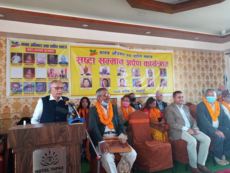 काठमाडौं । मानव अधिकार तथा शान्ति समाजद्वारा स्रष्टा सम्मान अभियान अन्तर्गत स्थापित पुरस्कारहरु मंगलवार काठमाण्डौमा आयोजित कार्यक्रममा प्रदान गरिएको छ । वर्ष २०७८ को महाप्रसाद रिजाल लोकतन्त्र स्रष्टा सम्मान श्रवण मुकारुङ, चन्द्रकला खनाल अहिंसा स्रष्टा सम्मान प्रा.डा.वेणीमाधव ढकाल, कृष्णकुमारी दाहाल शान्ति स्रष्टा सम्मान रामरिझन यादव, ज्ञानप्रसाद खनाल सहिष्णुता स्रष्टा सम्मान रामबहादुर पहाडी, राधादेवी दाहाल सद्भाव स्रष्टा सम्मान रत्ननिधि रेग्मी, मानबहादुर रावल वातावरण स्रष्टा सम्मान रामेश्वरी पन्त, गणेशबहादुर श्रेष्ठ स्रष्टा सौगात प्रतिसरा सायमी, जोगमाया बराल स्रष्टा सौगात विना थिङ तामाङ, राधादेवी दाहाल स्रष्टा सौगात मनु विक, जनककुमारी रेग्मी स्रष्टा सौगात मेनका पोखरेल आचार्य, पद्यप्रसाद दाहाल स्रष्टा सौगात देवकी तिमल्सिना रोकाया, श्रीप्रसाद दाहाल स्रष्टा सौगात सुदेश सत्याल र वर्ष २०७७ को राधादेवी दाहाल सद्भाव स्रष्टा सम्मान निलम कार्की निहारिकालाई प्रदान गरिएको हो ।
