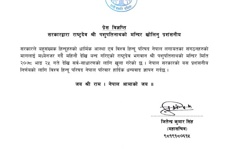 श्रीपशुपतिनाथको मन्दिर खोलिनु प्रशंसनीयः विश्व हिन्दू परिषद नेपाल